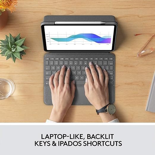 The Logitech Folio Touch Keyboard Case also has a backlit keyboard that auto-adjusts to your environment with 16 levels of brightness. It also has a full row of iPadOS shortcut keys that provide one-tap access to volume controls and more. The keyboard is laptop-like and comfortable to type on.